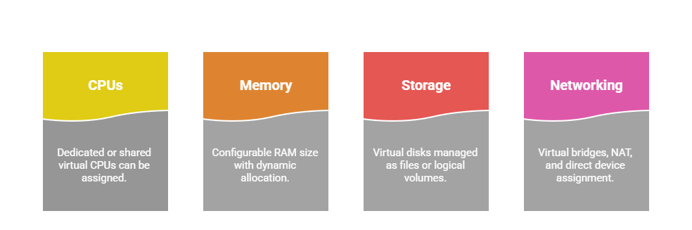 3. Libvirt: A management layer providing APIs, CLI (virsh), and GUIs (virt-manager) to control KVM/QEMU. Handles VM creation, monitoring, snapshots, and resource allocation.
