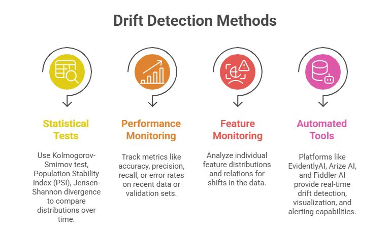 2. Retraining Models: Periodic or triggered retraining using fresh data to cope with drift.