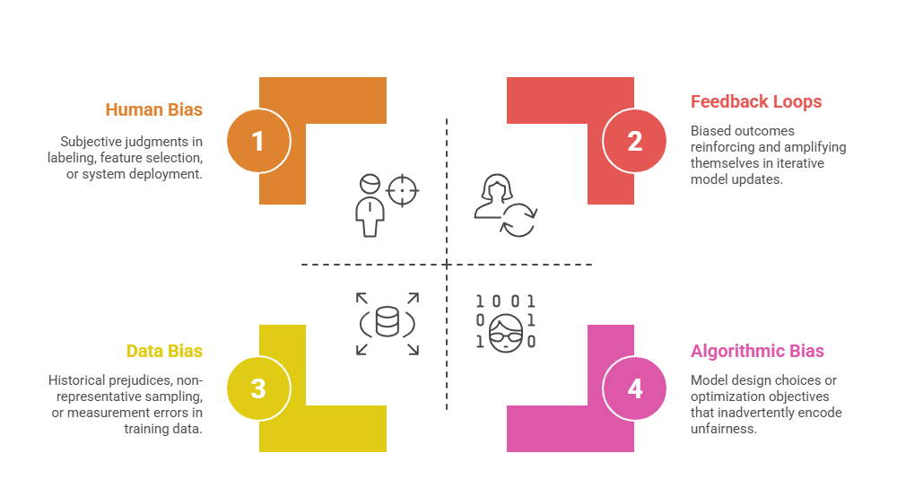 Several factors can unintentionally embed prejudice or skewed patterns into AI systems. The list below highlights the most frequent origins of bias in machine learning.