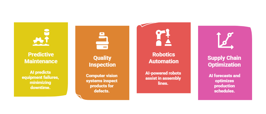 AI applications in manufacturing focus on quality control, predictive maintenance, and automation.
