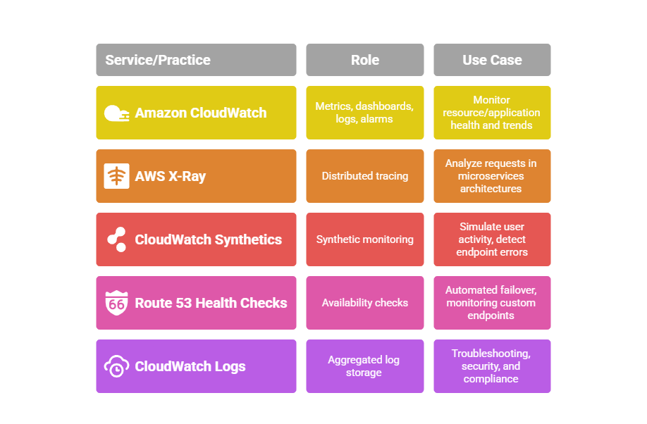 Amazon CloudWatch: Centralizes metric and log collection from nearly all AWS services.