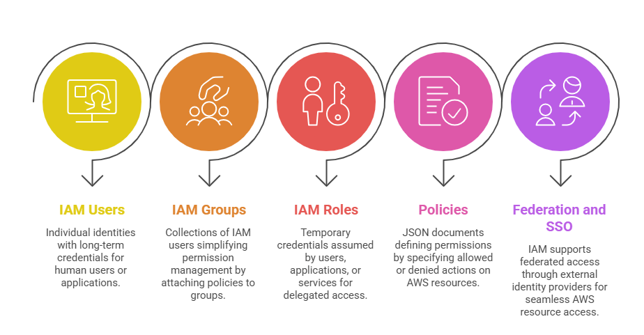 However, using the root account for everyday operations is discouraged due to security risks. Instead, IAM enables creating multiple identities, such as IAM users, groups, and roles, with finely tuned permissions.