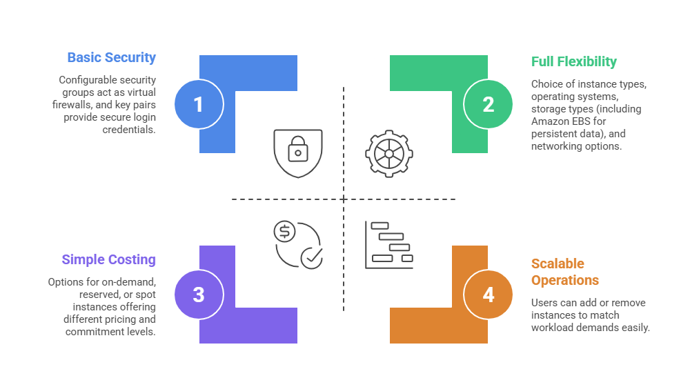 Amazon EC2 provides on-demand, resizable computing capacity in the form of virtual servers called instances. Users can launch and manage these instances to run applications just as they would on physical servers, but with far greater flexibility.