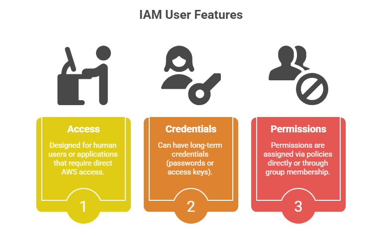 Each user has a unique identity with credentials such as passwords or access keys, which allow them to sign in and make requests to AWS services.