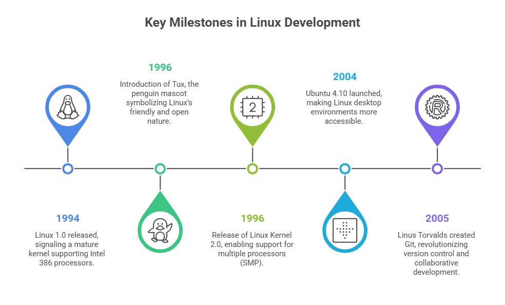 The mid-1990s saw the birth of major Linux distributions (distros) like Slackware (1993), Debian (1993), Red Hat Linux (1994), and SUSE Linux (1994), which packaged the kernel with software to create full-fledged operating systems tailored for various uses.