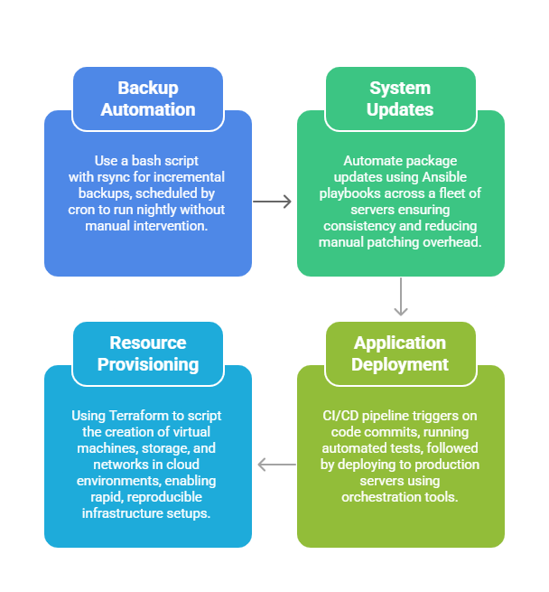 1. Task Automation: Automating routine tasks such as backups, updates, monitoring, and file management using scripts and cron jobs.
