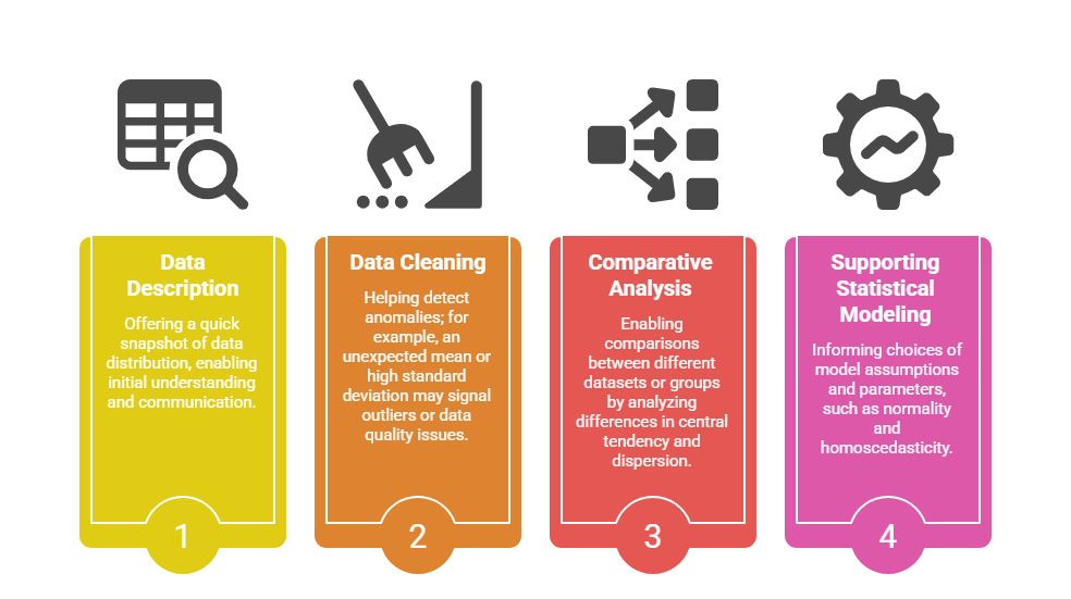 By condensing complex and large amounts of data into simple numerical values, they help analysts, researchers, and decision-makers quickly understand key characteristics such as central tendency, variability, and data distribution.