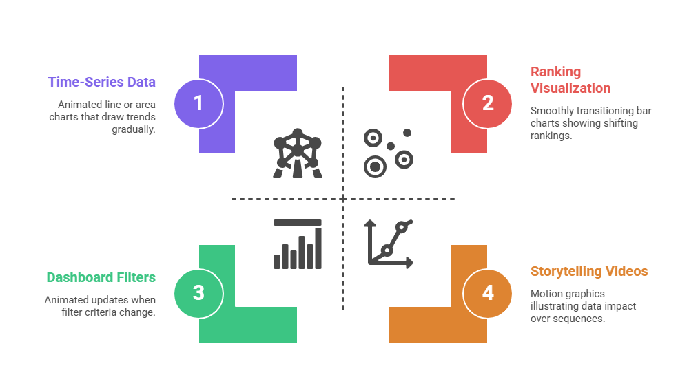 Visual storytelling benefits from subtle motion cues that signal change or focus attention. Outlined here are the main types of transitions and animations used in modern dashboards and charts.