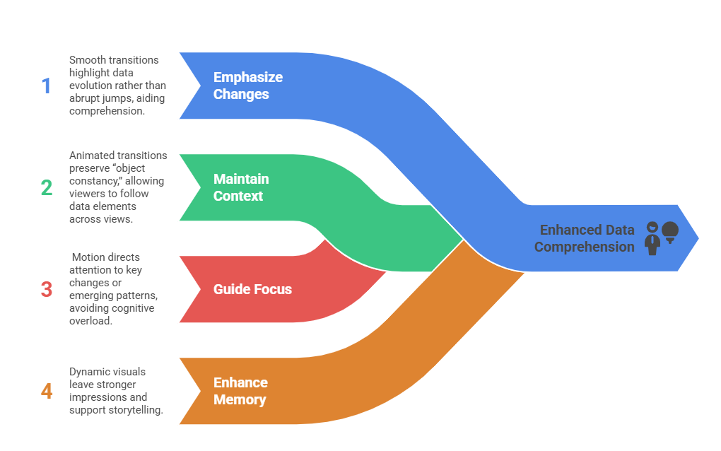 In modern data visualization, motion and transitions play a critical role in enhancing user engagement by making data stories more dynamic, intuitive, and memorable.