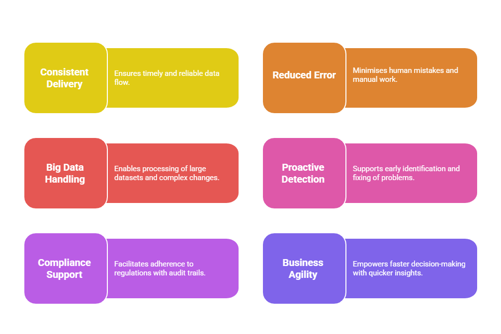 Automation of these pipelines minimises manual intervention, reduces errors, accelerates processing, and ensures data freshness.