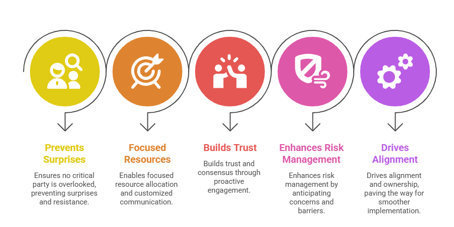 Proper identification and analysis enable tailored communication, foster collaboration, mitigate risks, and enhance buy-in, ultimately aligning project outcomes with organizational goals and stakeholder interests.
