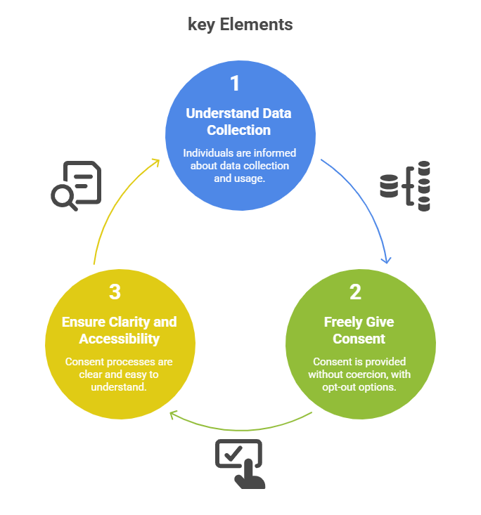 Consent means obtaining informed, voluntary permission from individuals before collecting, using, or sharing their data.
