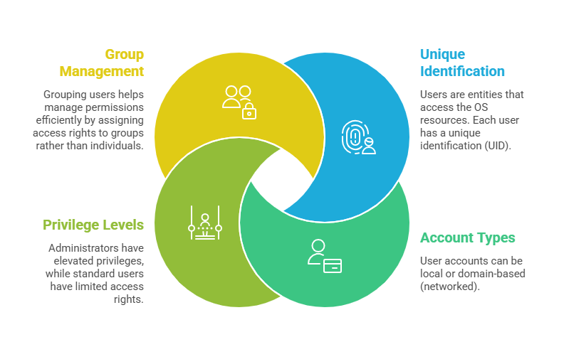 For example, a file's permissions might allow the owner full access, the group read-only access, and others no access. Windows uses Access Control Lists (ACLs) for granular permissions; Linux uses a simpler model based on rwx bits and ACLs.