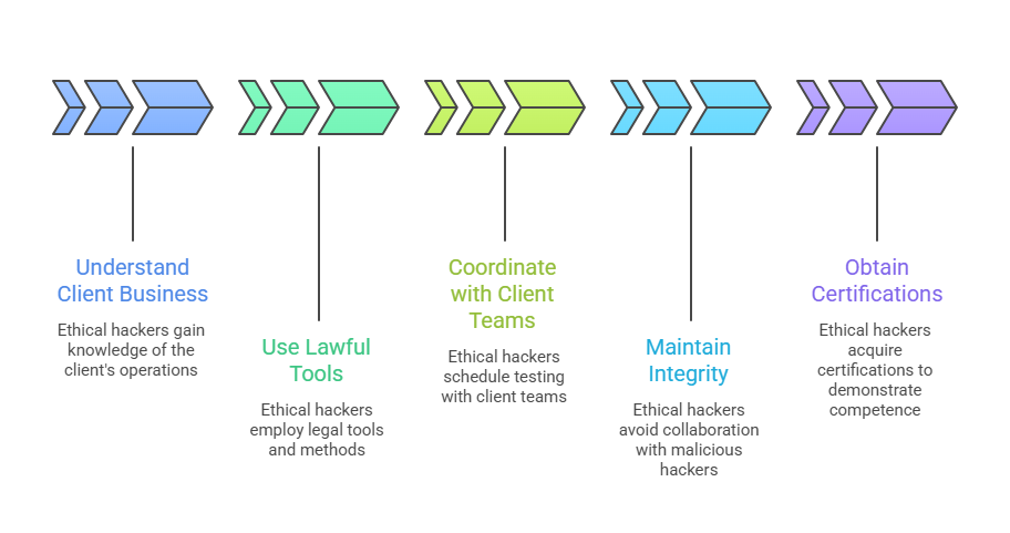 The effectiveness and credibility of ethical hacking depend on observance of well-established ethical norms. Outlined here are the central principles every ethical hacker is expected to uphold:
