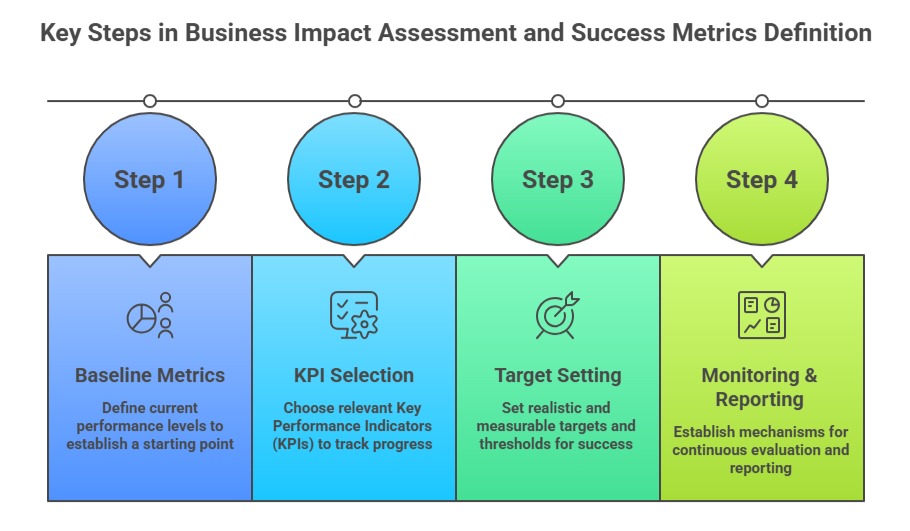 This includes identifying Key Performance Indicators (KPIs) aligned with organizational goals and tracking them before and after implementing analytics-driven solutions.