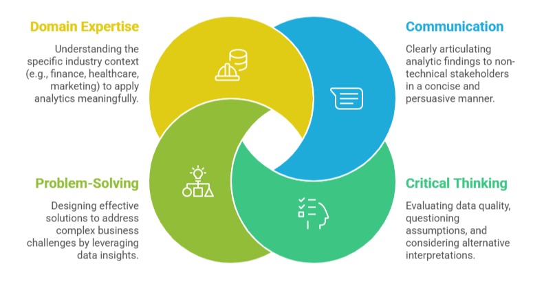 These interpersonal and cognitive skills facilitate collaboration and ensure analytics outcomes align with organizational objectives.