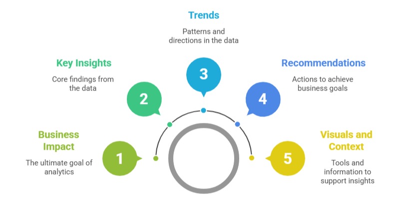Condensing complex analytics into clear, concise narratives that emphasize business impact. Key insights are prioritized, trends highlighted, and recommendations presented in alignment with organizational goals.