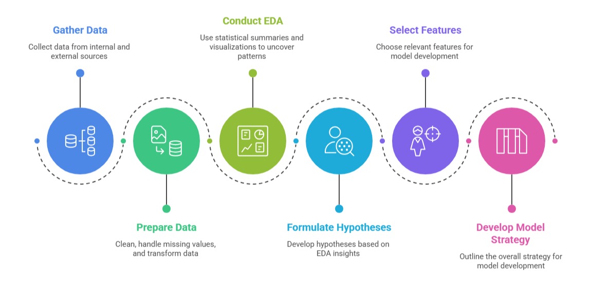 Data collection, preparation, and exploratory analysis begin with gathering relevant data from internal systems, external sources, and third-party providers.