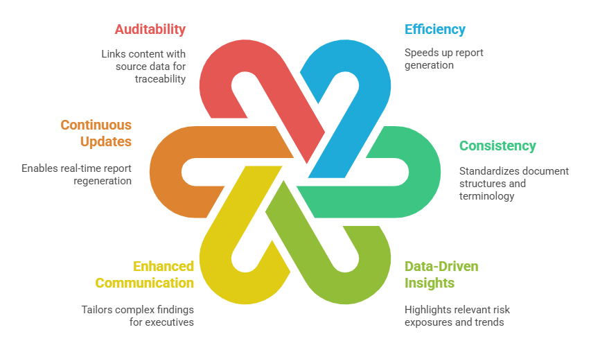 Manual report drafting, especially for complex risk assessments, can be time-consuming, error-prone, and inconsistent. Artificial Intelligence (AI) significantly transforms this process by automating report generation, including risk summaries and executive overviews.