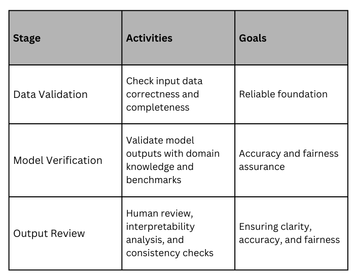 3. Explainability and Transparency: Utilize interpretability tools (e.g., SHAP, LIME) to understand why specific outputs were generated, aiding validation.
