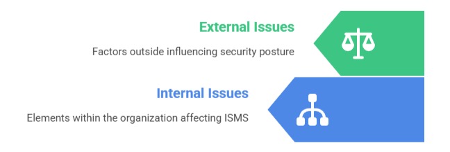 1. Internal Issues: These are elements within the organization that affect ISMS implementation, such as organizational structure, culture, available resources (financial, technological, human), policies and procedures, existing technologies, and staff competencies.