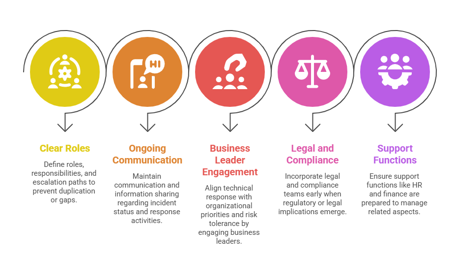 | Legal and Compliance | Integrate for regulatory awareness, guide breach notifications, and maintain evidence integrity |