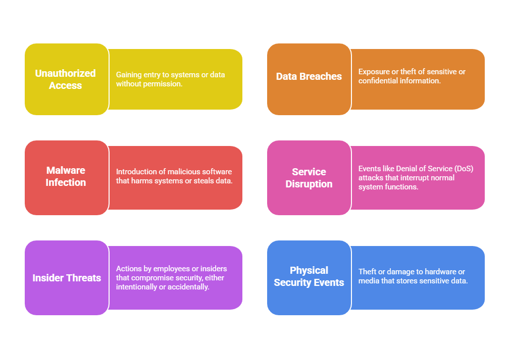 Information security incidents are events that threaten the confidentiality, integrity, or availability of an organization’s information assets. These incidents can disrupt business operations, expose sensitive data, or cause reputational and financial damage.