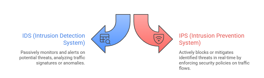 IDS/IPS can be network-based or host-based, detecting attacks like port scans, malware activity, or unauthorized access attempts.