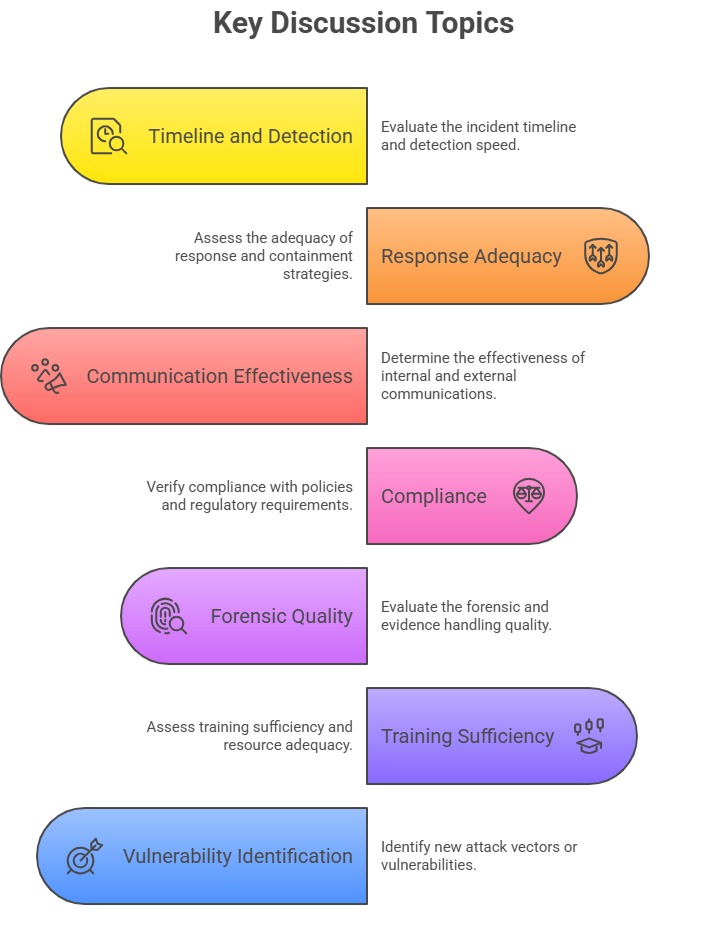 These activities involve a structured and collaborative examination of the entire incident lifecycle to understand what happened, evaluate the response, and identify opportunities to improve security posture and incident handling capabilities.