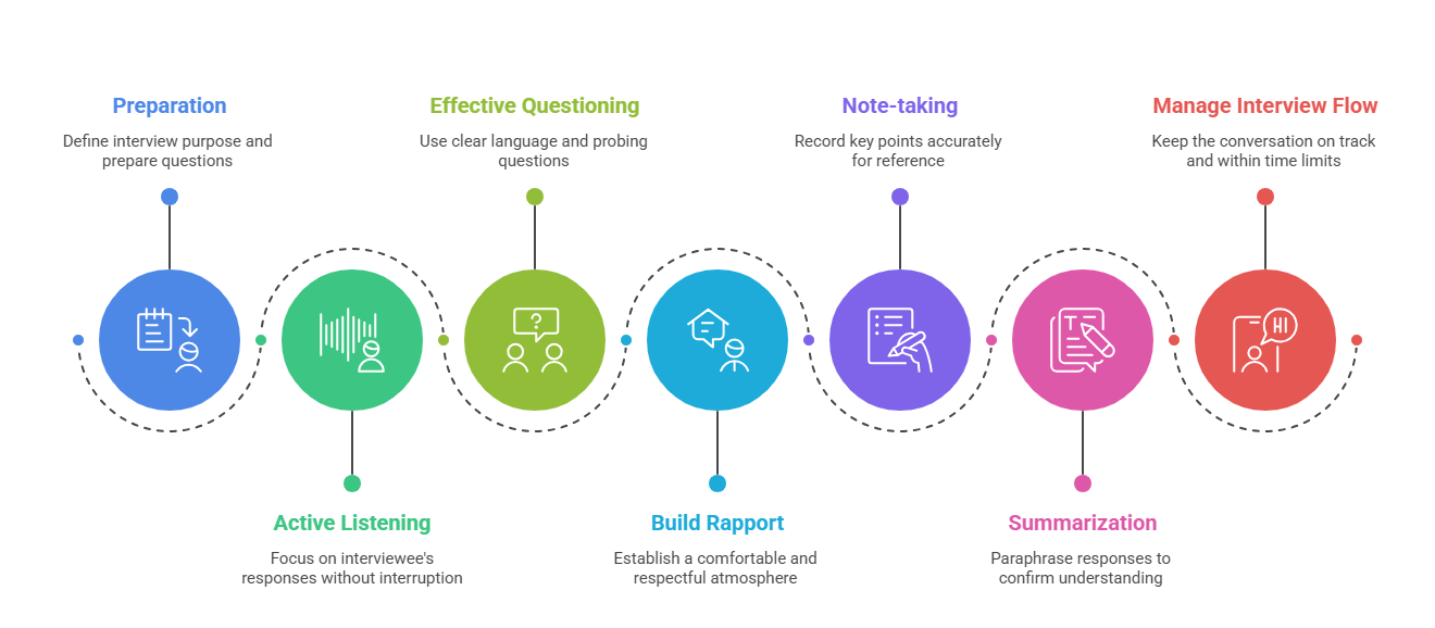 3. Effective Questioning: Use simple, clear language. Employ probing questions to explore incomplete or unclear answers, but avoid leading questions that may bias responses.