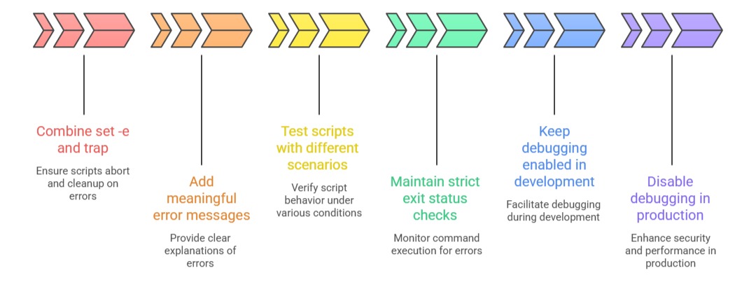 5. Debugging tools: Tools like bashdb provide step-through debugging with breakpoints.