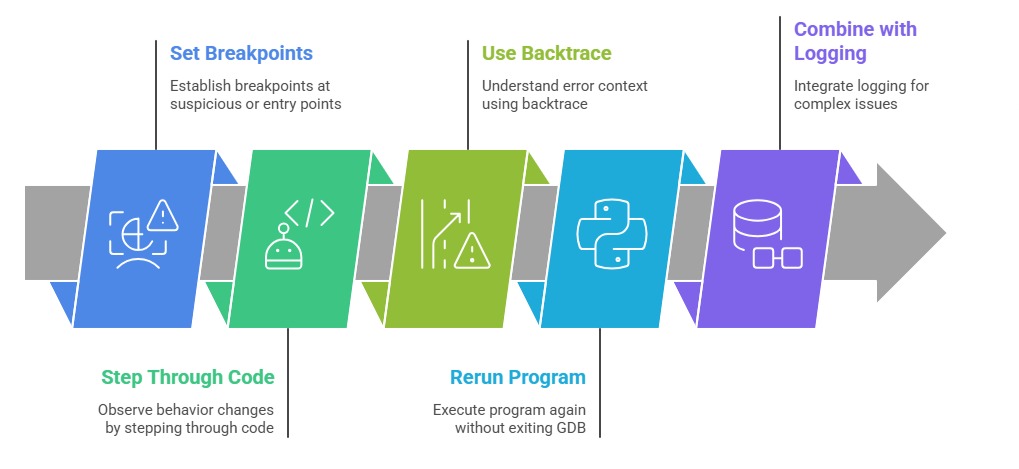 watch variable_name3. Core Dumps: Analyze crashes by loading core dump files.