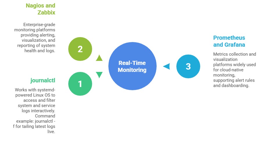 Real-time monitoring tools provide continuous visibility into system behavior and service health. The key tools listed below enable live log tracking, alerting, and performance visualization.