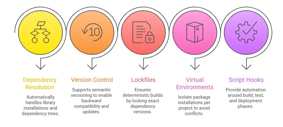 Language-specific package managers combine dependency management with environment control. The core features listed below explain how they ensure compatibility and reduce conflicts.
