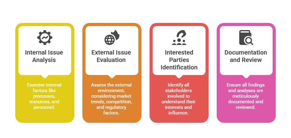 This involves identifying the internal and external issues that influence the organization’s purpose, strategic direction, and ability to achieve quality objectives.