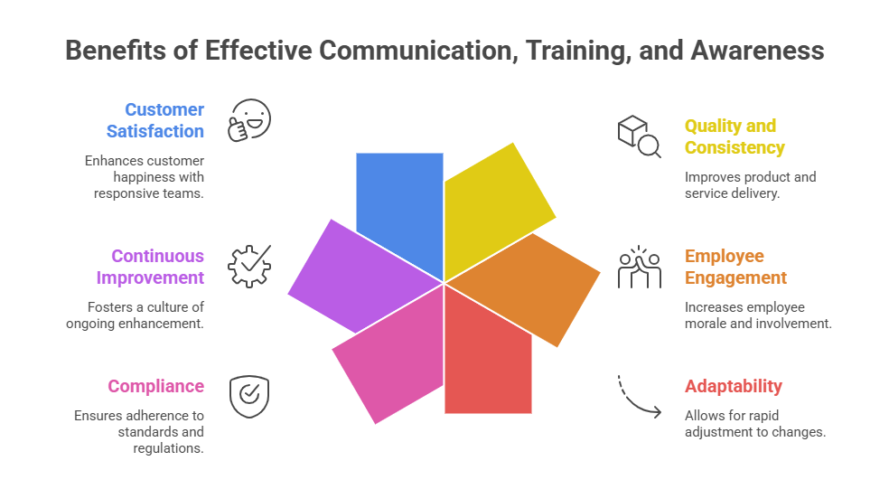 These can be delivered through communication campaigns, workshops, meetings, or informal discussions, and should highlight the organization's quality objectives, customer needs, risks, and the role everyone plays in achieving success.